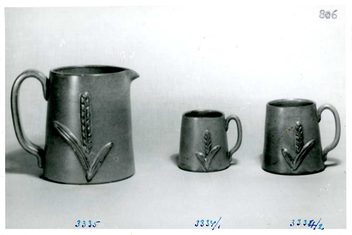 Kanna och två muggar med vete-relief från Bo Fajans, formgivare Eva Jancke-Björk, 1900-talets mitt.