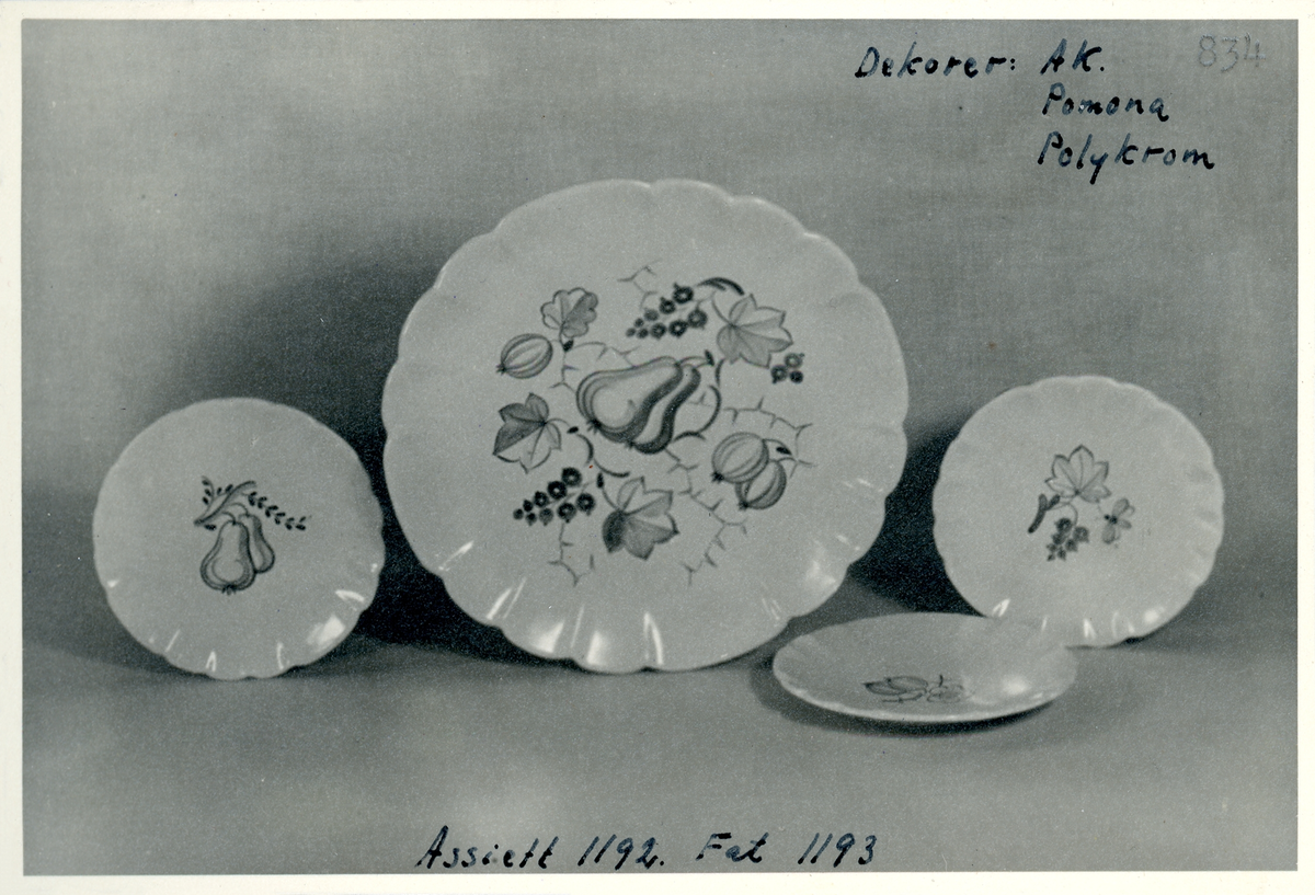 Assietter och fat från Bo Fajans, formgivare Allan Ebeling, tidigt 1900-tal. Dekorer AK, Pomona och Polykrom.