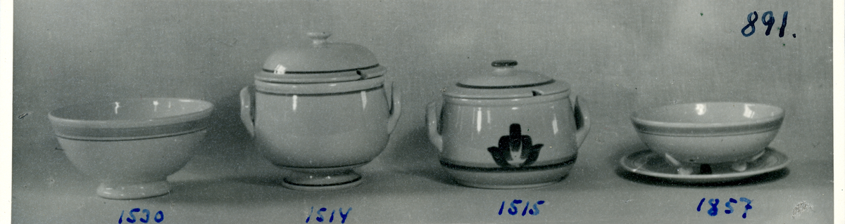 Soppskål, två terriner samt skål med fat från Bo Fajans, formgivare Allan Ebeling, 1900-talets mitt.