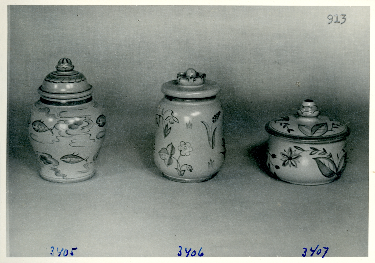 Två bojaner och en bonbonjär (till höger i bild) från Bo Fajans, formgivare Eva Jancke-Björk, 1900-talets mitt.