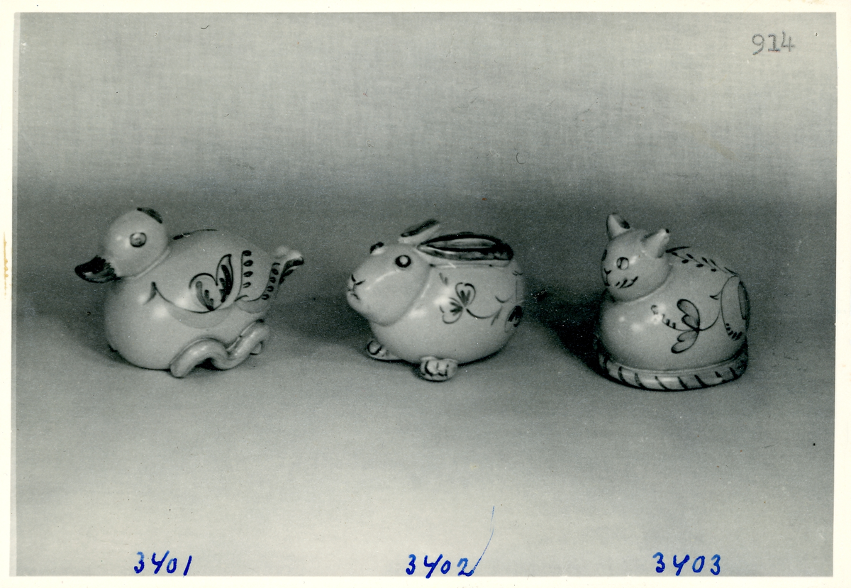 Sparbössor/Spargrisar från Bo Fajans, formgivare Eva Jancke-Björk, 1900-talets mitt. Anka, kanin och katt.