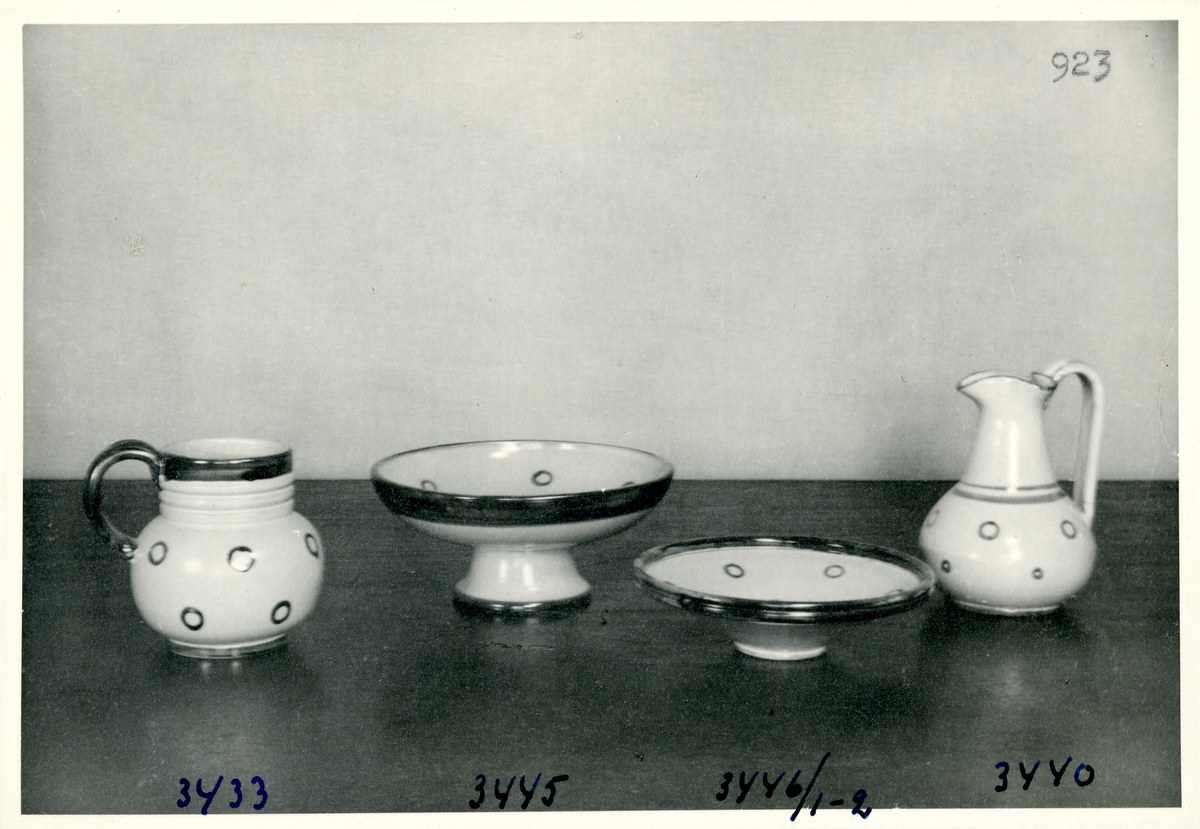Vas, skålar samt krus från Bo Fajans, formgivare Eva Jancke-Björk, 1900-talets mitt.