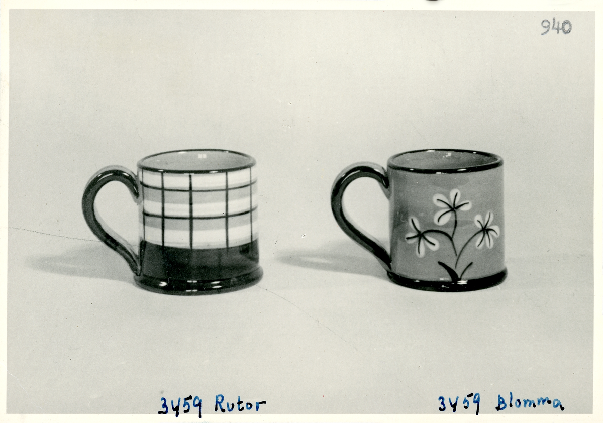 Muggar med dekorerna Rutor och Blomma från Bo Fajans, formgivare Eva Jancke-Björk, 1900-talets mitt.