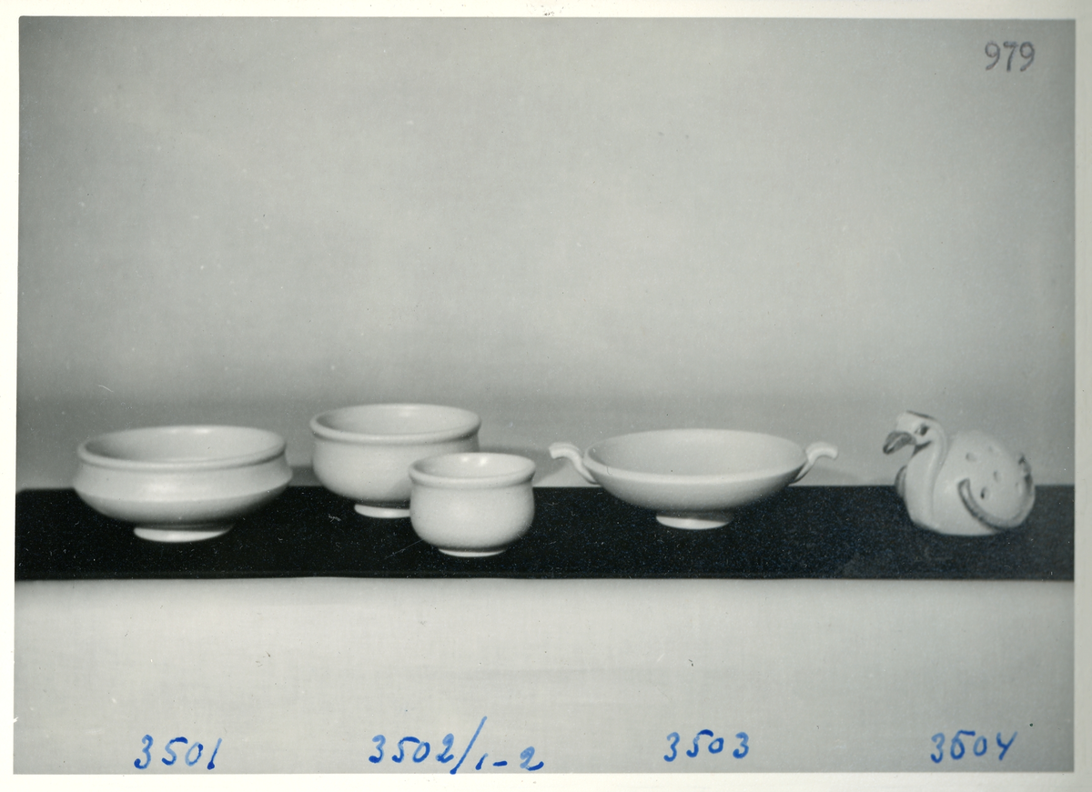 Fyra skålar och en blomhållare från Bo Fajans, formgivare Eva Jancke-Björk, 1900-talets mitt.