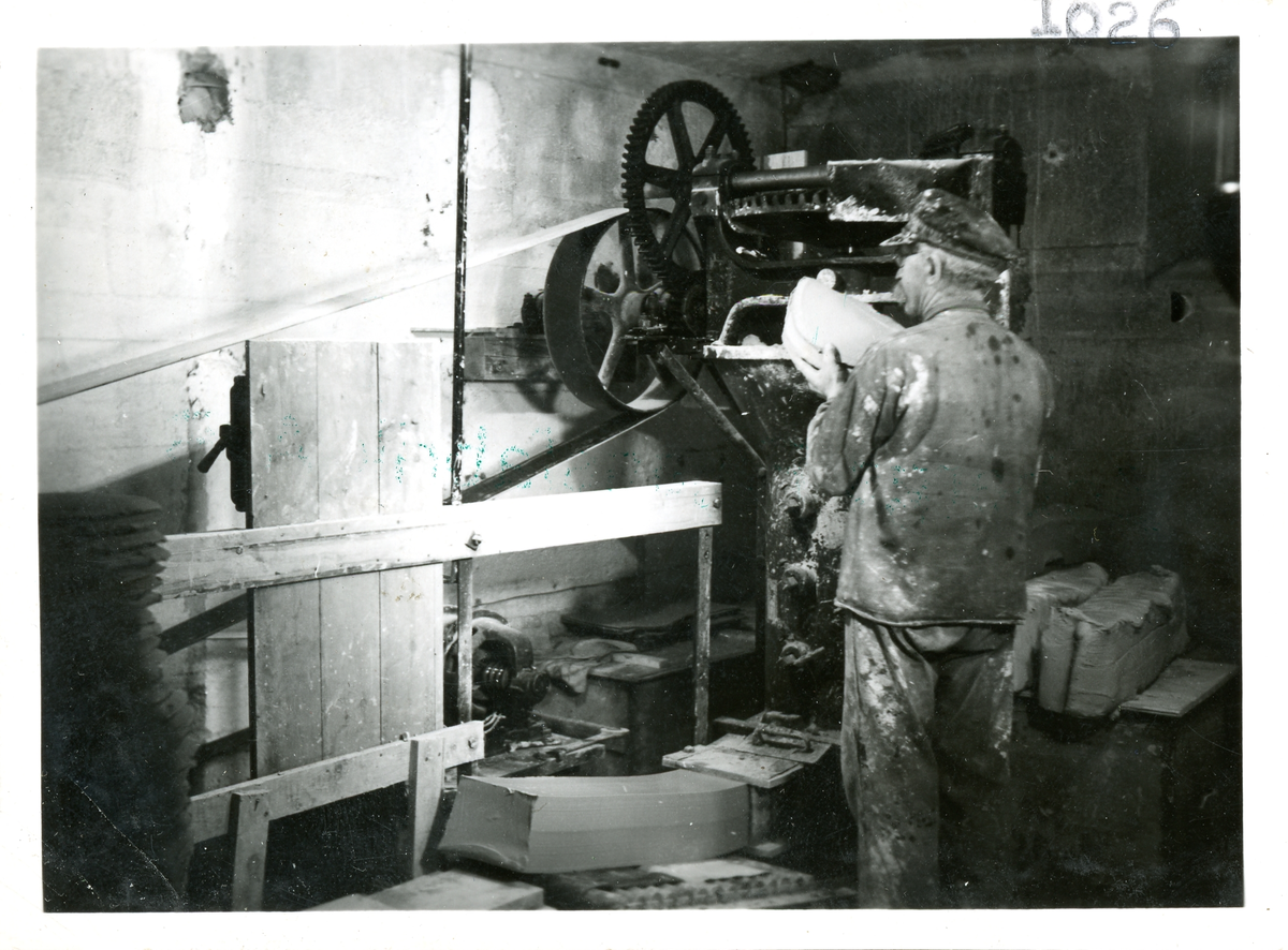 Bild från tillverkningen på Bo Fajans. Leran läggs in i lerkranen.