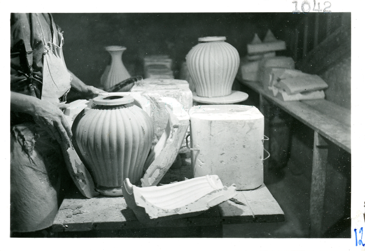 Bild från tillverkningen på Bo Fajans. Gjutning av kruka i gips form.