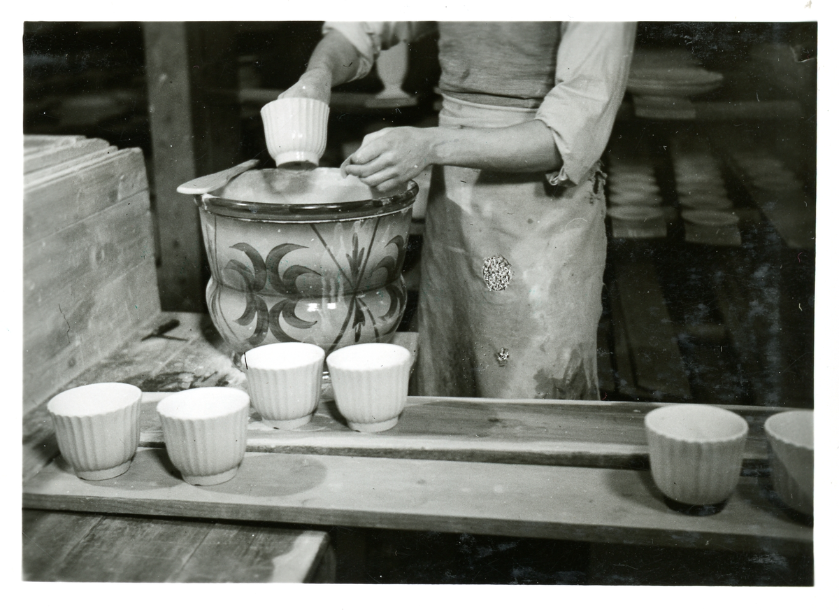 Bild från tillverkningen på Bo Fajans. Föremålet doppas i glasyren.