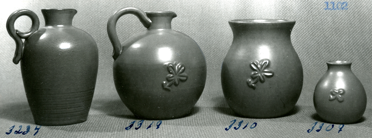 Två krus och två vaser, tre med relief från Bo Fajans, formgivare Eva Jancke-Björk, 1900-talets mitt.