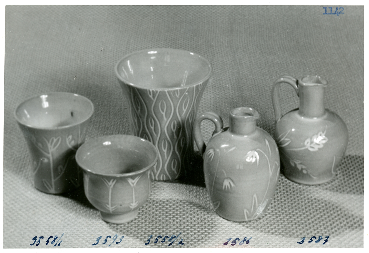 Bägare och krus med ristad vit dekor från Bo Fajans, formgivare Eva Jancke-Björk, 1900-talets mitt.