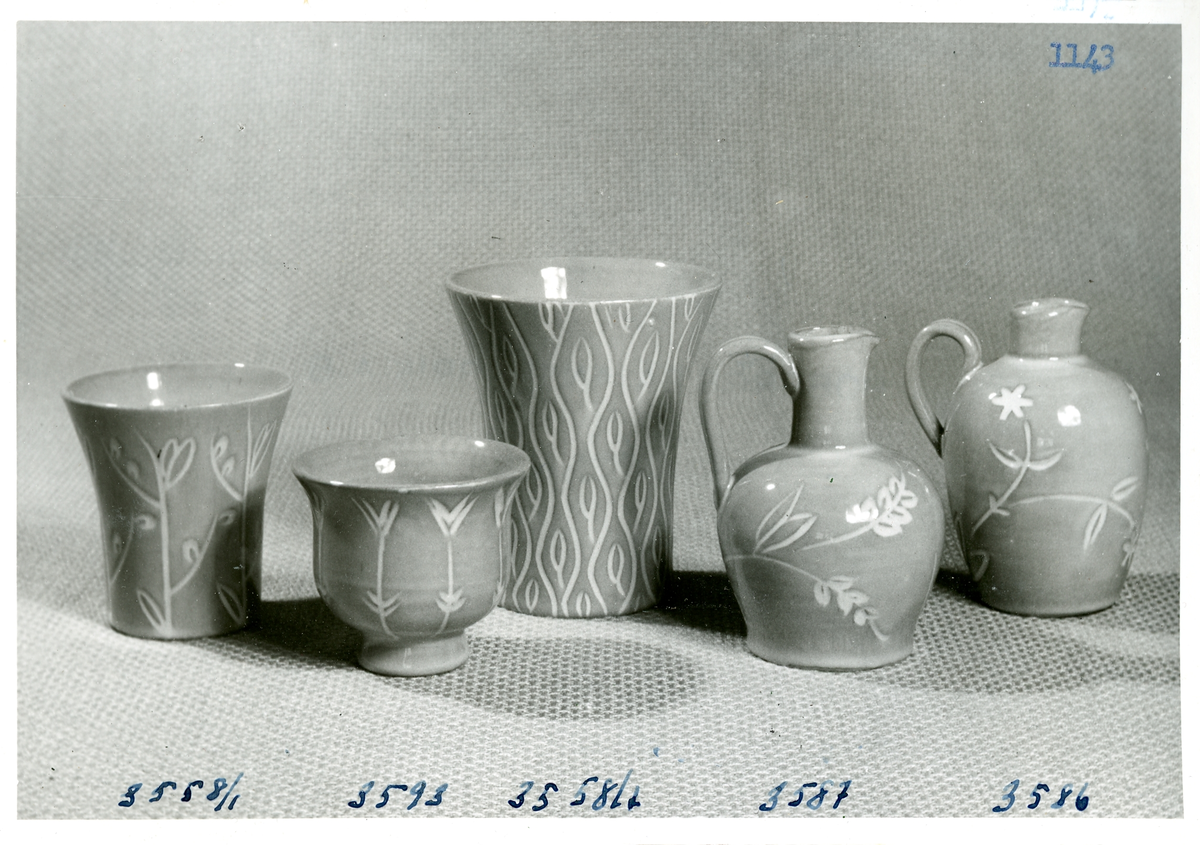 Bägare och krus med ristad vit dekor från Bo Fajans, formgivare Eva Jancke-Björk, 1900-talets mitt.