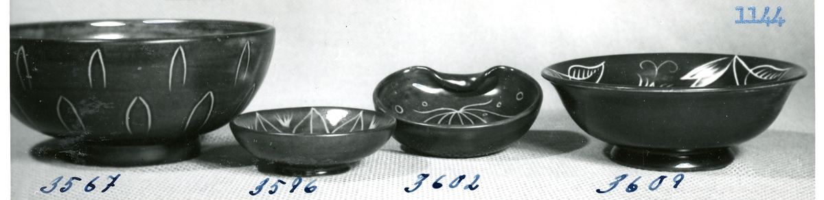 Skålar och askfat med ristad vit dekor från Bo Fajans, formgivare Eva Jancke-Björk, 1900-talets mitt.