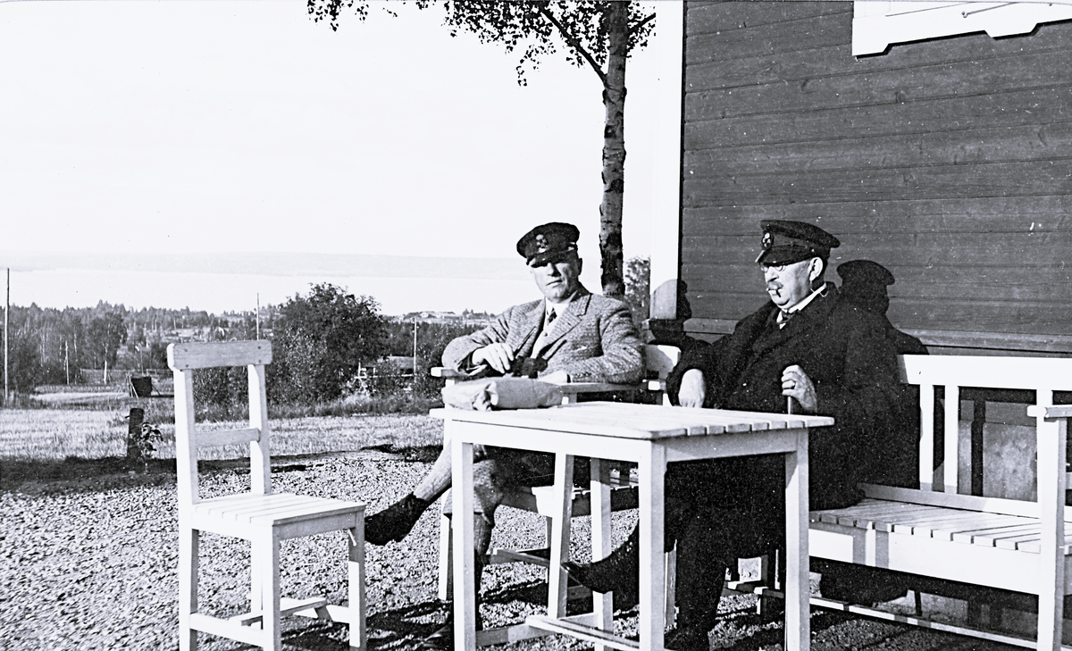 Två män som sitter utomhus och samtalar utanför ett pensionat med skymt av en sjö i bakgrunden (troligen Siljan). Text i album: "Johanssons Pensionat, Tällberg 1925".