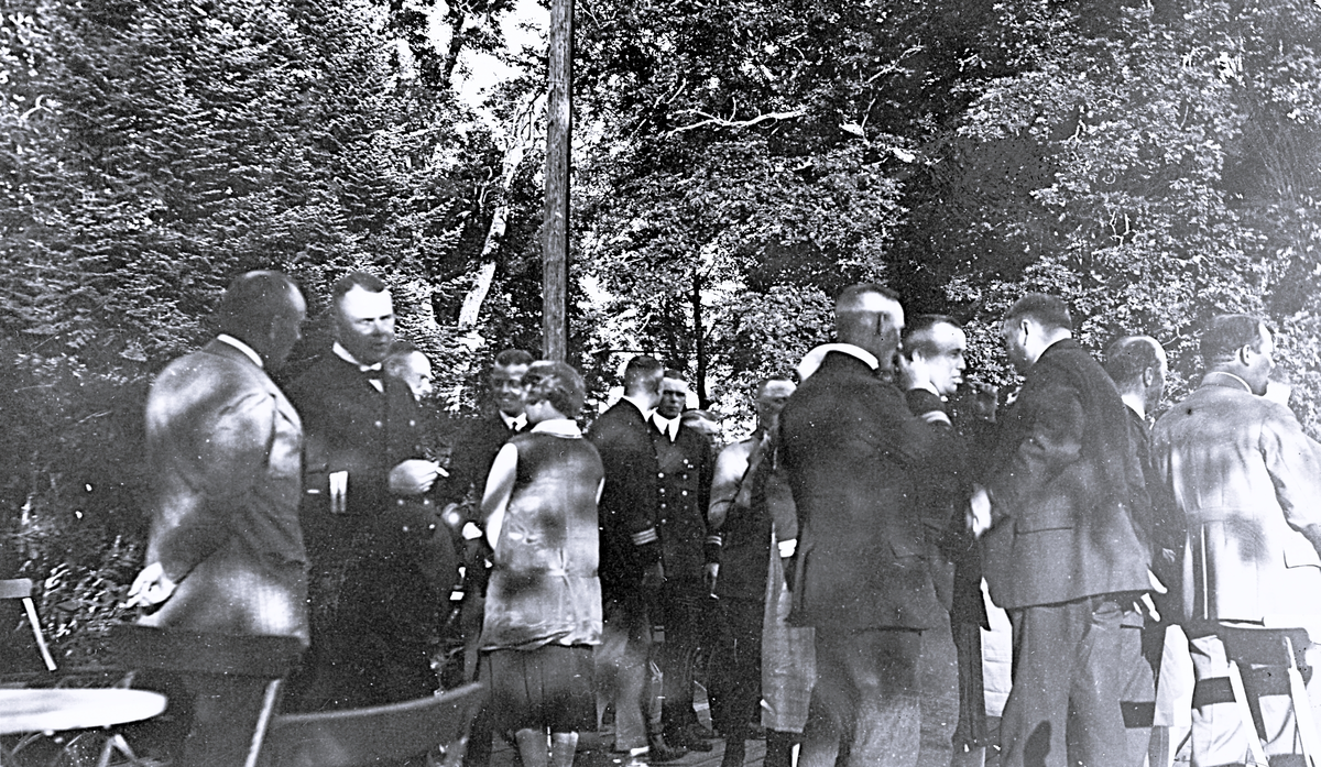 En grupp män med uniformer som står och samtalar. Text i album: "Middag för tyska sjöofficerare å Elfkarleö, sommaren 1926".