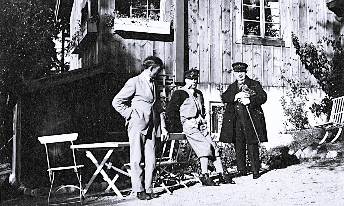 Tre män som står framför en byggnad varav den till höger håller i en katt och käpp. Text i album: " Plintsberg, 1925".