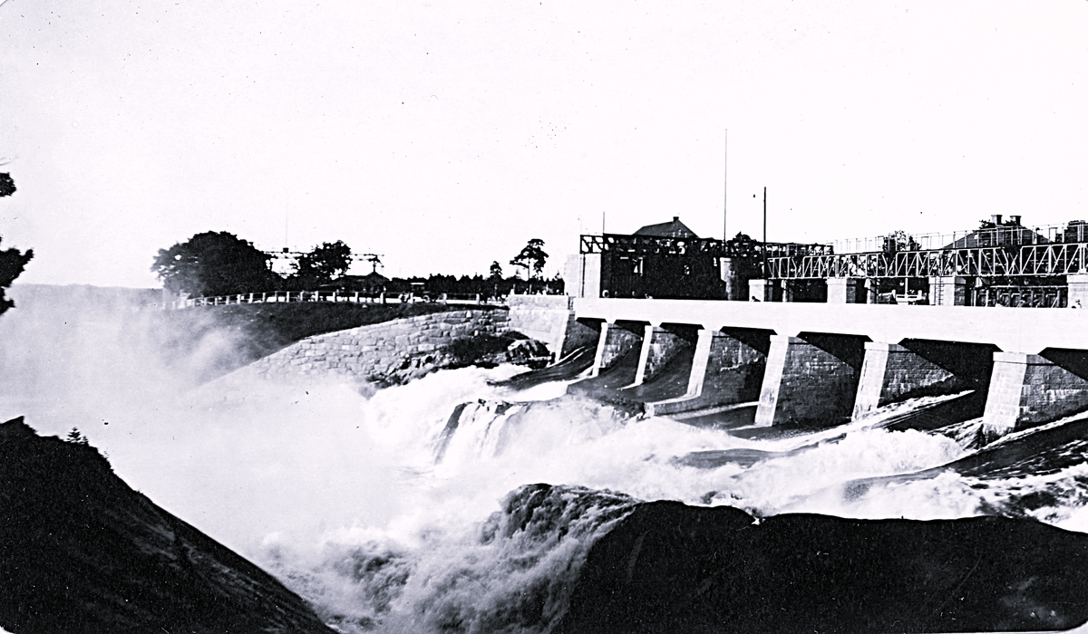 Älvkarleby kraftverks dammar som är öppna, ligger cirka 8 km från Dalälvens mynning. Text i album: "Elfkarleö Kraftstation 1926".