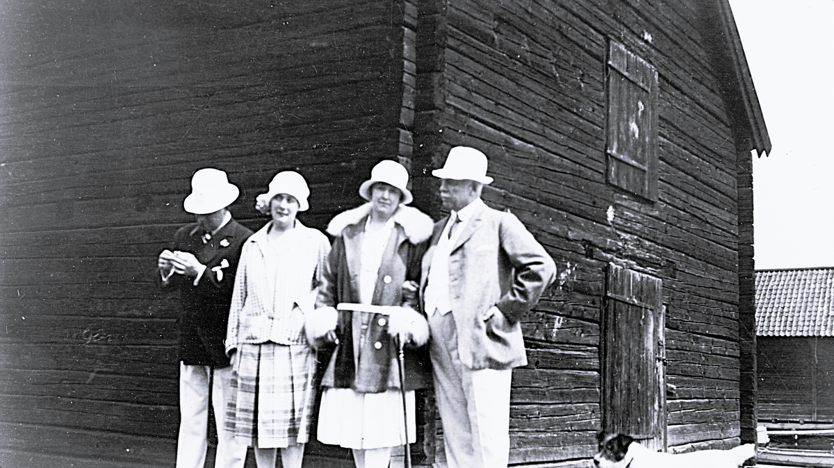 En grupp människor som står vid en äldre byggnad, någonstans i Öregrund. Text i album: "Öregrund 1927".
