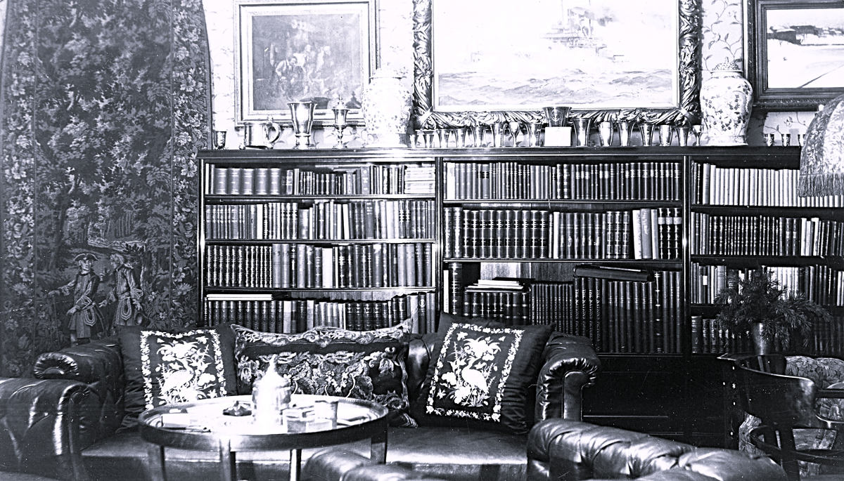 Ett rum med en bokhylla fylld med böcker, två tavlor på väggen, en stor soffa och kuddar med mönster. Text i album: "Vårt hem - Mitt rum".