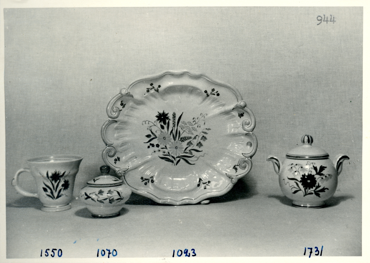 Bägare, bonbonjär, fruktfat och sockerskål i dekor Sommar från Bo Fajans, formgivare Allan Ebeling, tidigt 1900-tal.
