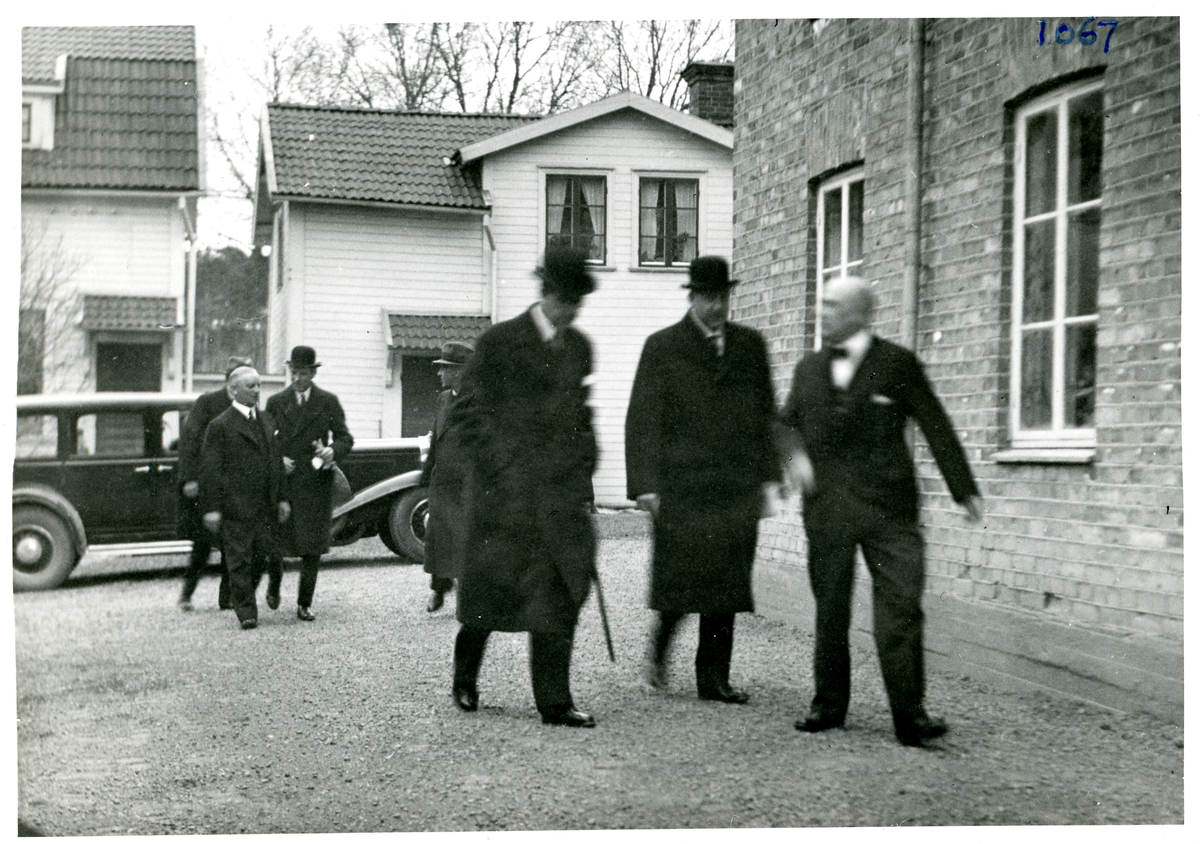 H.K.H. Kronprins Gustaf Adolf (blivande Gustav IV Adolf) besöker Bo Fajans fabriksområde tillsammans med landshövding Sven Lübeck (mitten i förgrunden) och fabrikör John Boberg (längst till höger i förgrunden), 10/4 1935.