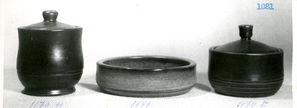 Två tobaksburkar och ett askfat från Bo Fajans, formgivare Allan Ebeling, tidigt 1900-tal.