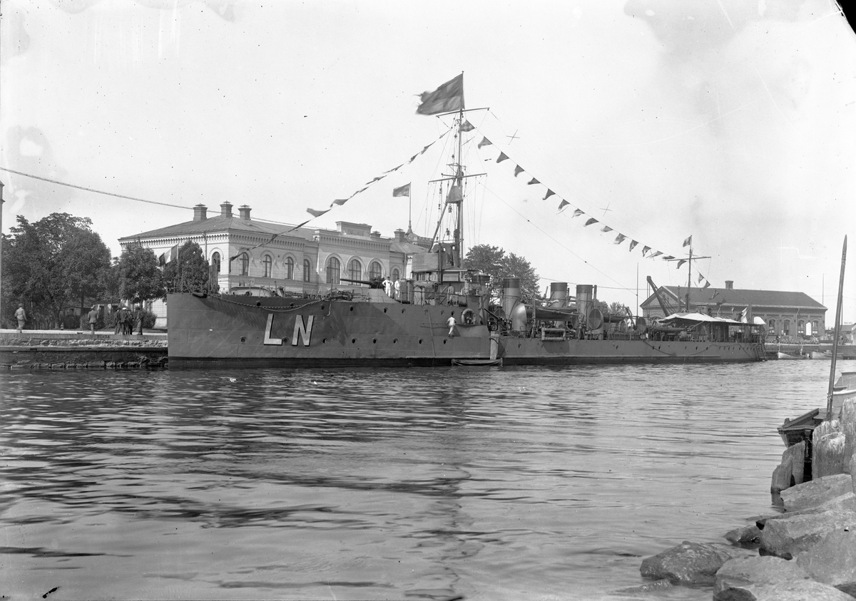 Jagare med märkningen LN utanför gamla tullhuset i Gävle utför en stor flaggning. MIlitär bestyckning synlig vid fören.