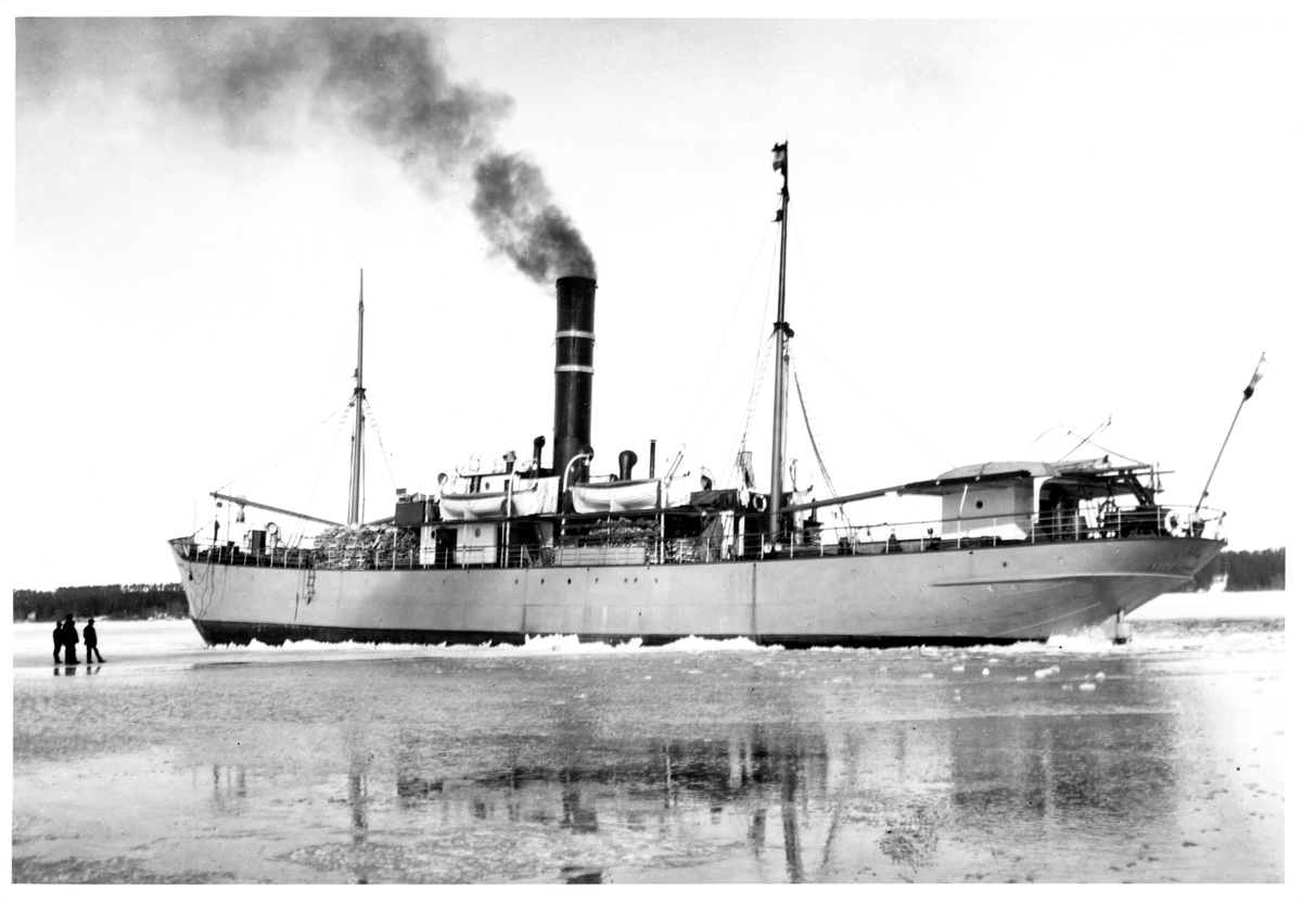 Ångfartyg fast i isarna utanför Gävle. Vid fören står en grupp människor på isen och iaktar det som pågår. På däck syns två stora högar med ved.