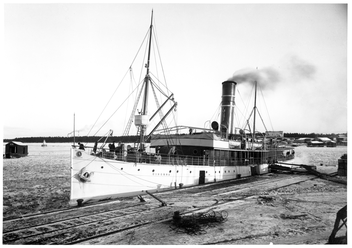 Passagerarångaren "S/S Oihonna" förtöjd vid en kaj i Gävle hamn vintertid. Till vänster och höger i bild syns små pårmar med skjul, den till vänster i bild med namnet "Delfin".
