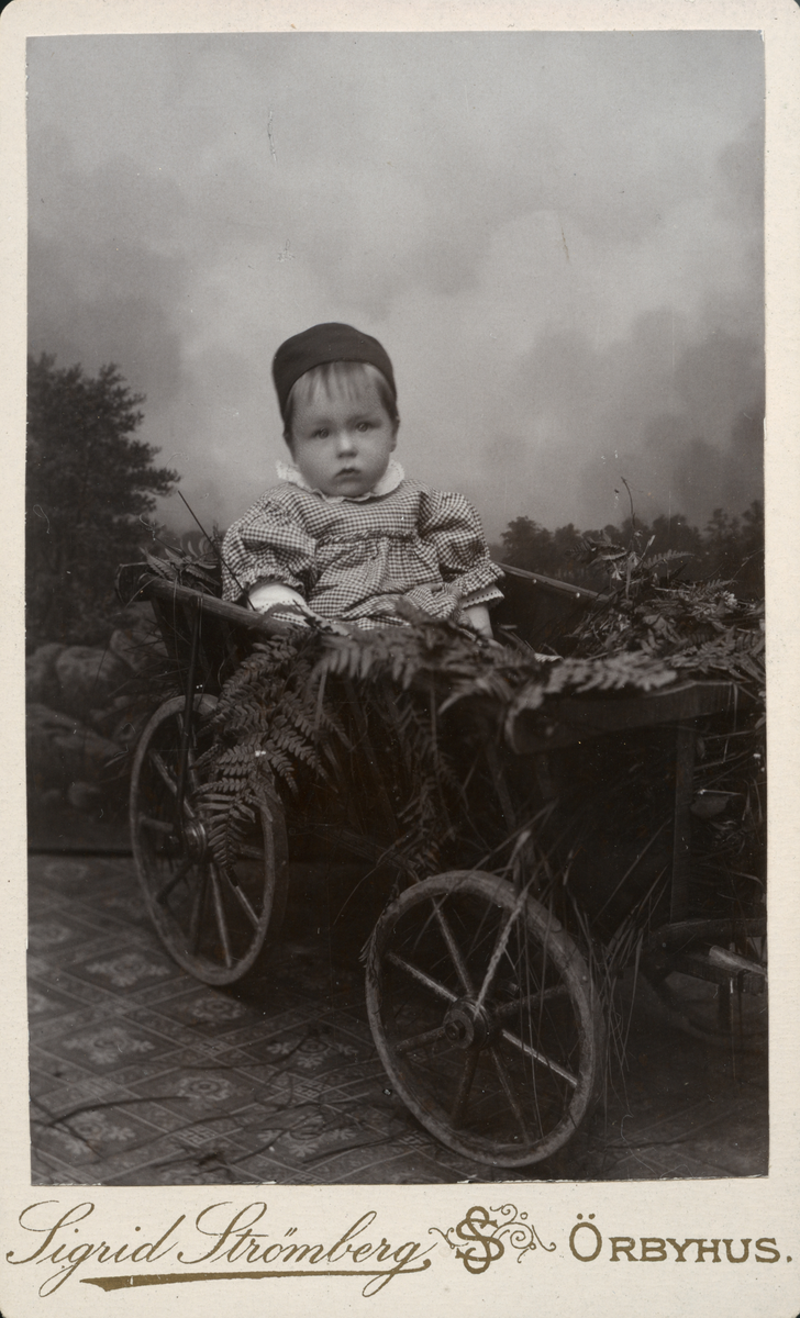 Titel: Porträtt av ett barn som sitter i en skrinda.