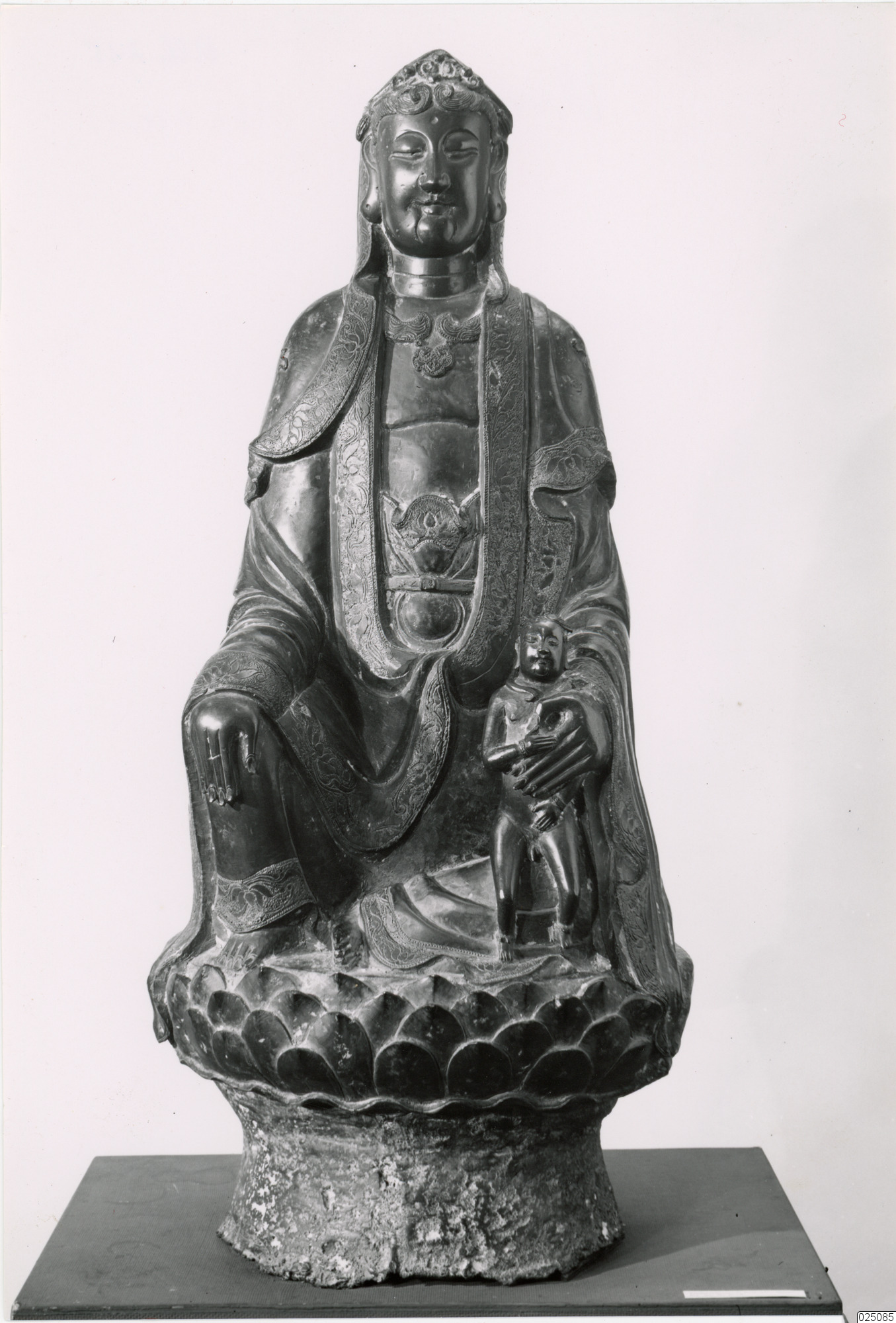 En grön bronsstaty av Guanyin sittande på en lotustron med en person i miniatyr sittande på sitt vänstra knä.