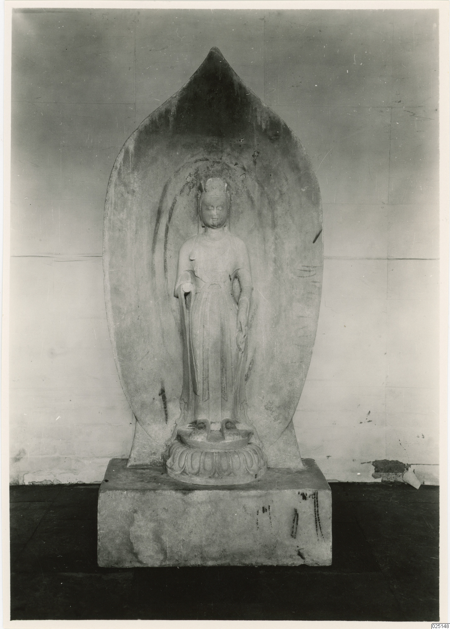 En stele med en sittande bodhisattva i mitten och en mindre stående på vardera sidan.