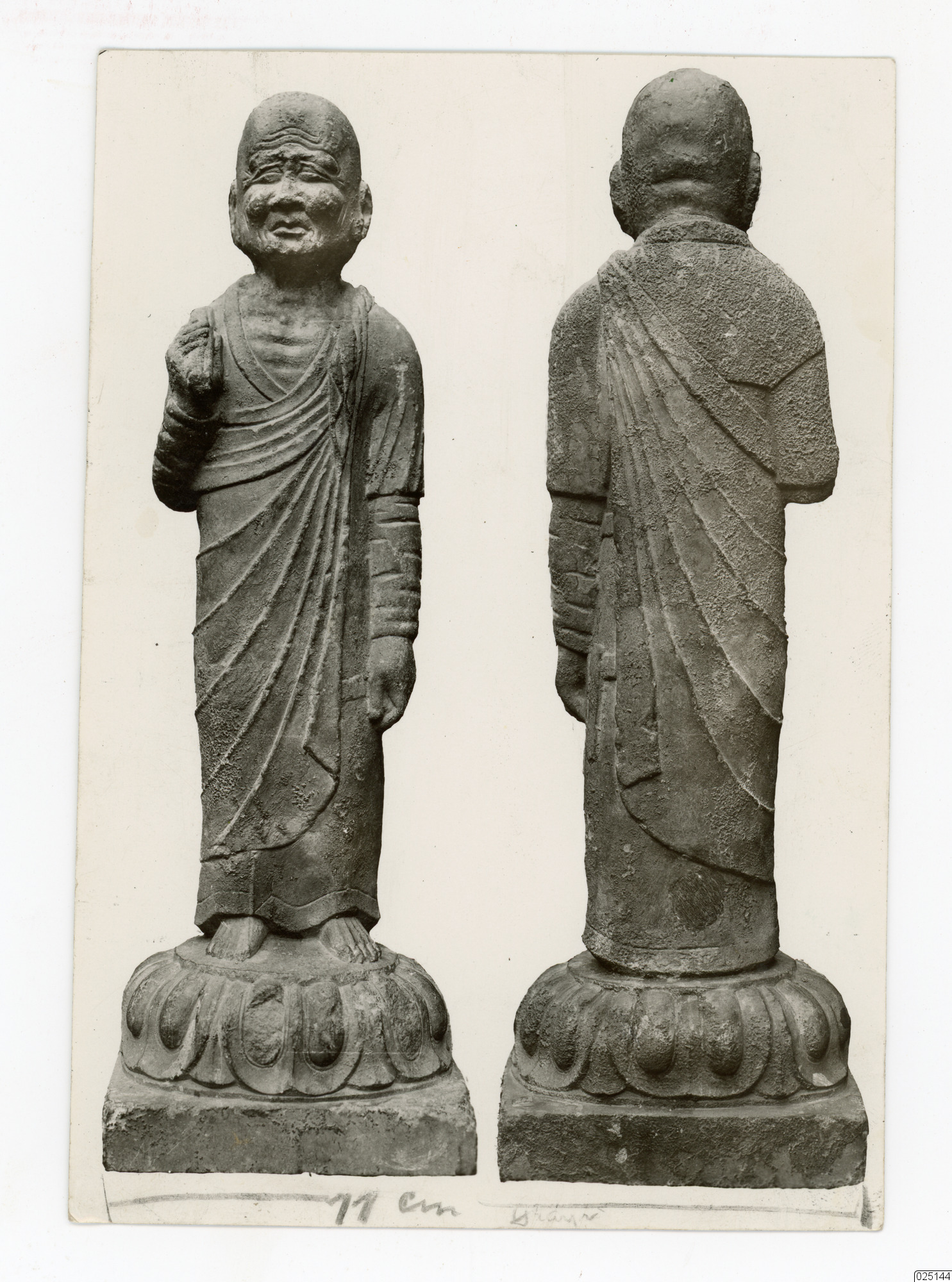 En stele i kalksten av en Bodhisattva sittandes på en tron med en person ståendes på vardera sida om sig.