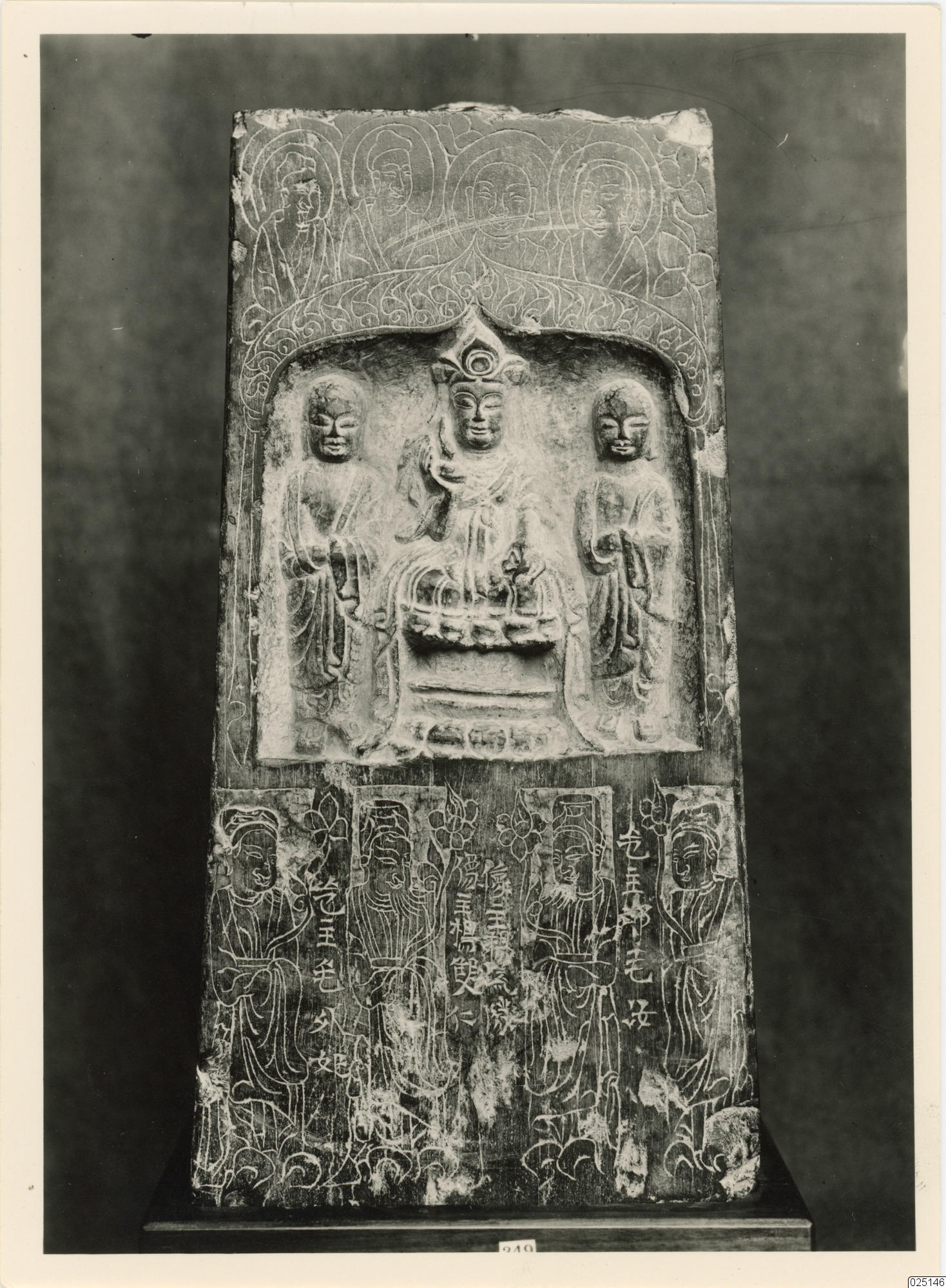 En stele med tre utkarvade bodhisattvor, en sittandes i mitten och en stående på vardera sida. Undre delen innehar inskriptioner och inristade bodhisattvor.