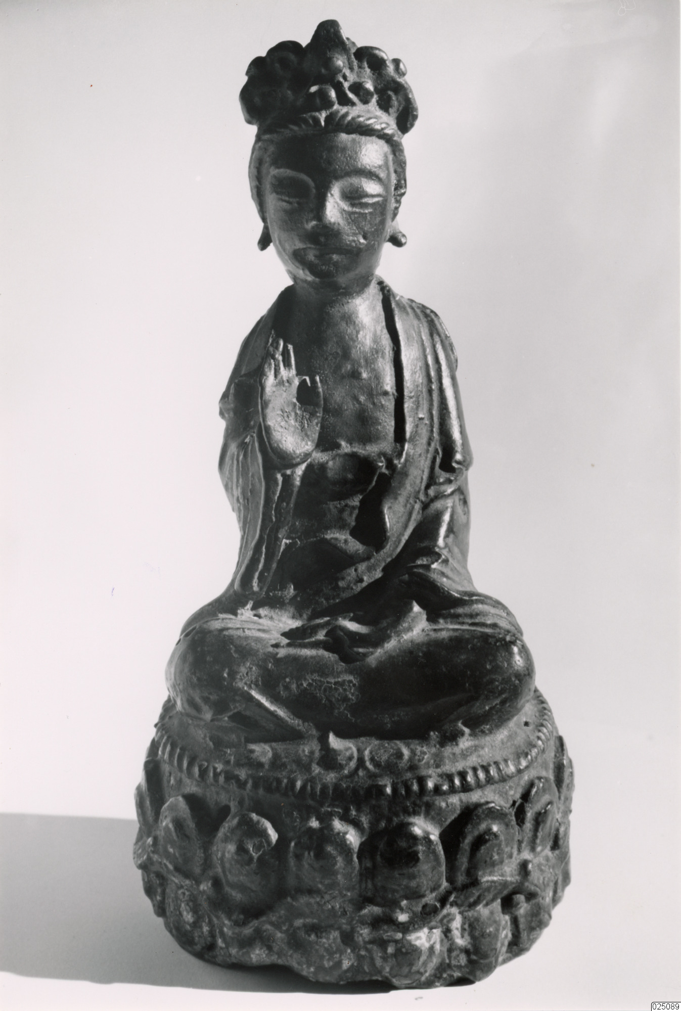 En bronsstaty av en av en Buddhistisk divinitey, kanske Amitâbha, sittande på en lotustron.