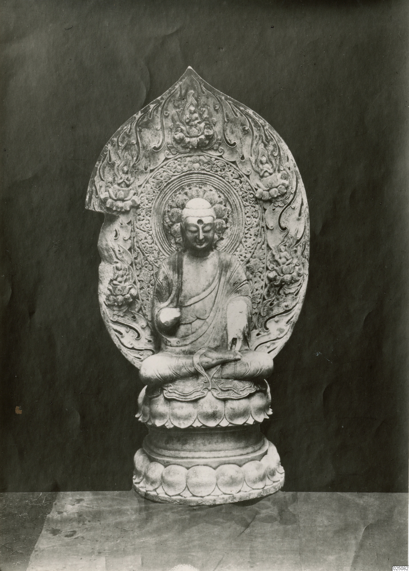En staty i vit marmor föreställande ett sittande lejon (framsida).