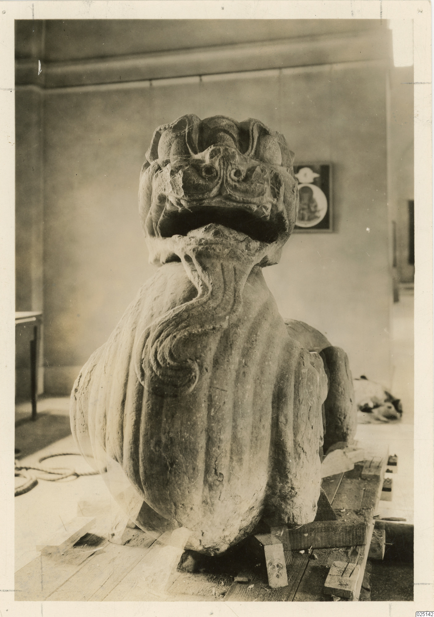 En stor sten-staty av en chimera liggandes på alla fyra ben.