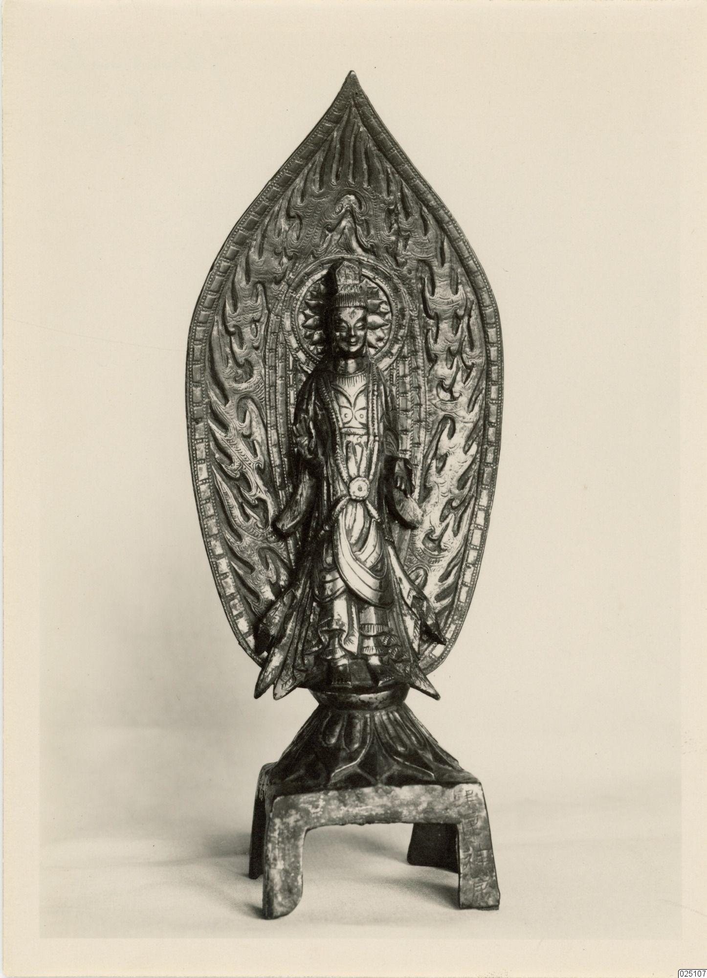 En staty av en Bodhisattva troligen gjord i sandsten, stående på en lotustron med vad som ser ut som en liten budda sittande på sitt huvud.