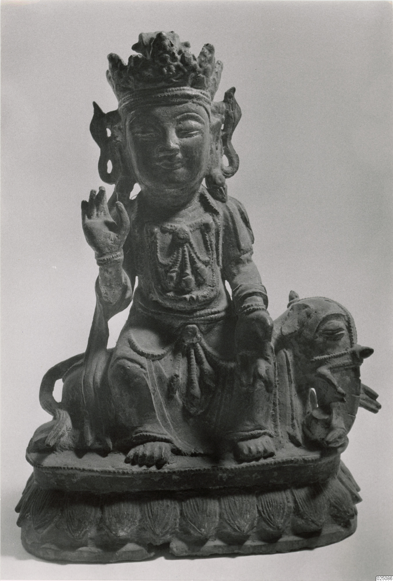 En bronsstaty av Bodhisattva Manjushri sittandes på ett djur/väsen.