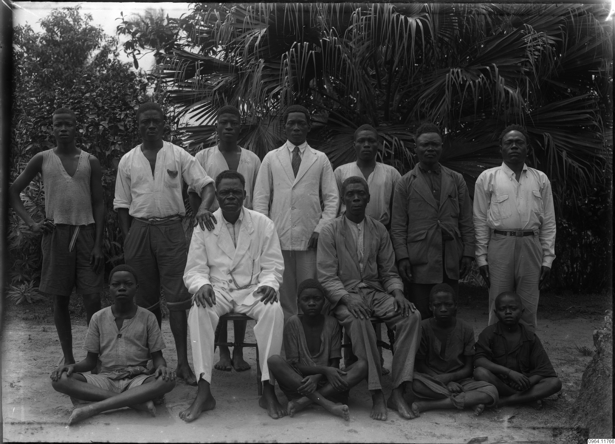 Två män sitter på stolar, övriga står. Några pojkar sitter på marken. Evangelister?