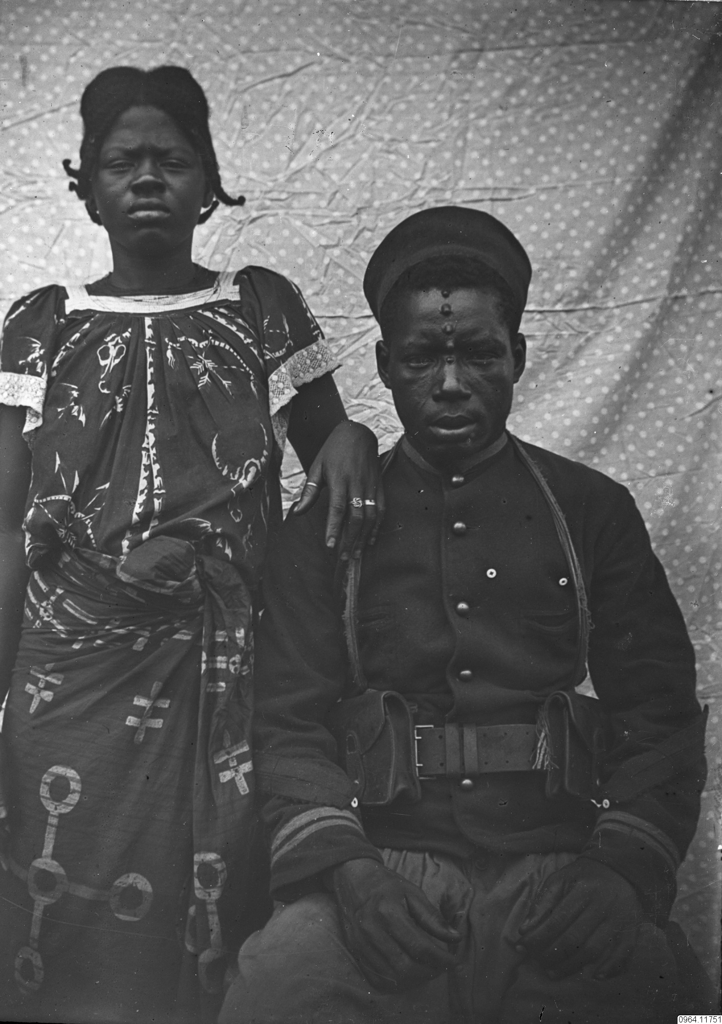 En man med uniform som sitter. Han har ärrtatueringar i pannan. Bredvid står en kvinna och håller sin hand på mannens axel. Man och fru?