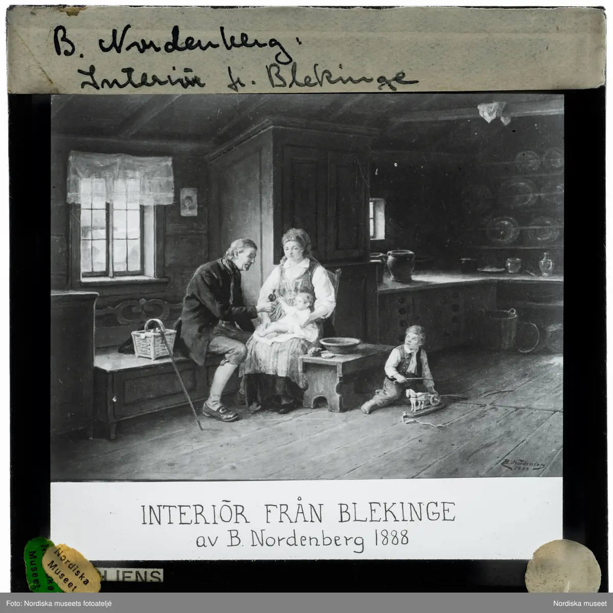 "Interiör från Blekinge". Rumsinteriör med en äldre man och en kvinna med två små barn, illustration av Bengt Nordenberg 1888, ur Nordiska museets skioptikonsamling.