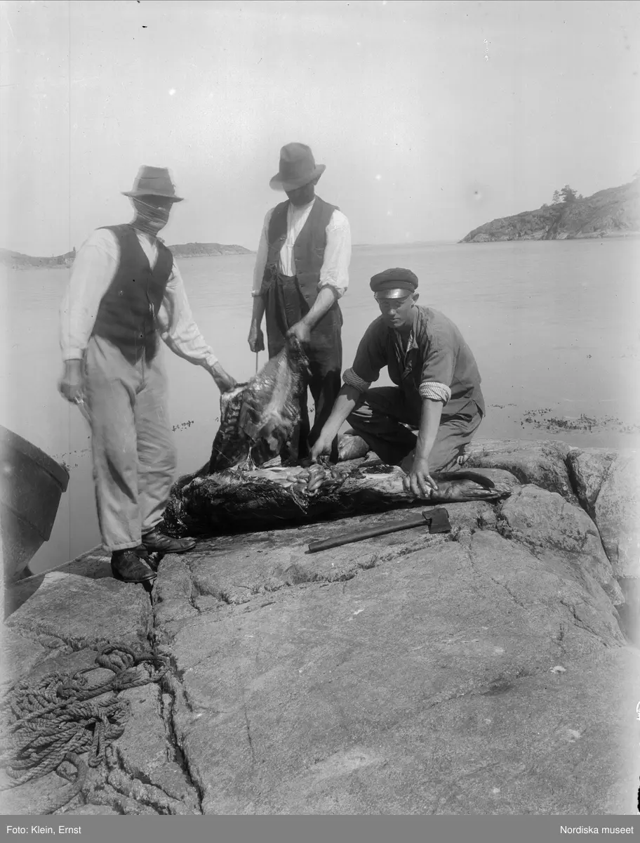 Tre män styckar en säl. Gryts socken, Östergötland.