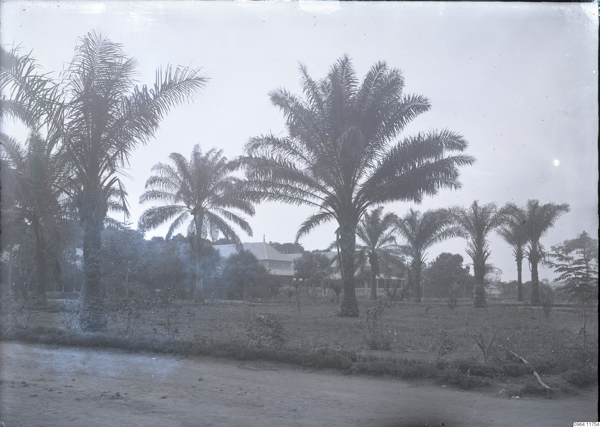 En samling palmer, troligen dadelpalmer eller oljepalmer, med en byggnad i bakgrunden. I förgrunden en väg.