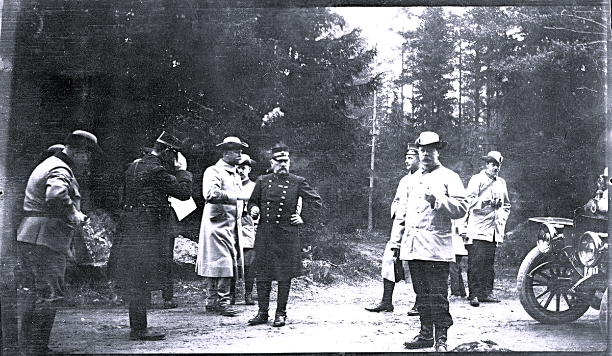 Foto av en grupp militärer ute på uppdrag, i bakgrunden syns skog. Text på baksida kort: "Landstormsbefälhavarna okt. 1910 inom Gäfle l.o."