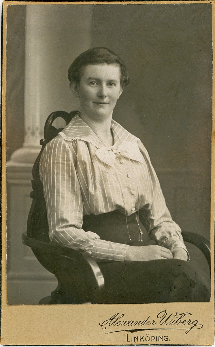 En kvinna i smalrandig blus och mörk kjol sitter i en karmstol.
