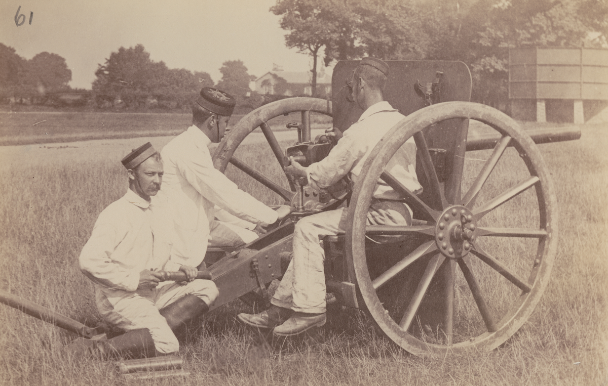 Text bak på foto: "47 mm gun on field carriage" 47 mm kanon på fältvagn, med tre operatörer av vapnet, som sitter bakom stötdämpande skyddssvägg för rekylen.