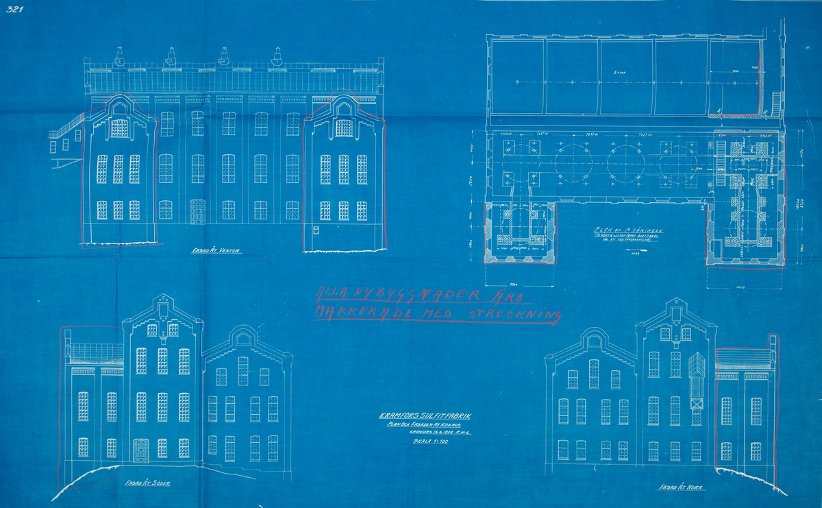 Blåkopia. Ritning över Kramfors sulfitfabrik. Plan och fasader av kokhus. Skala 1:100. Utförd av R.W-G. 13 april 1908.