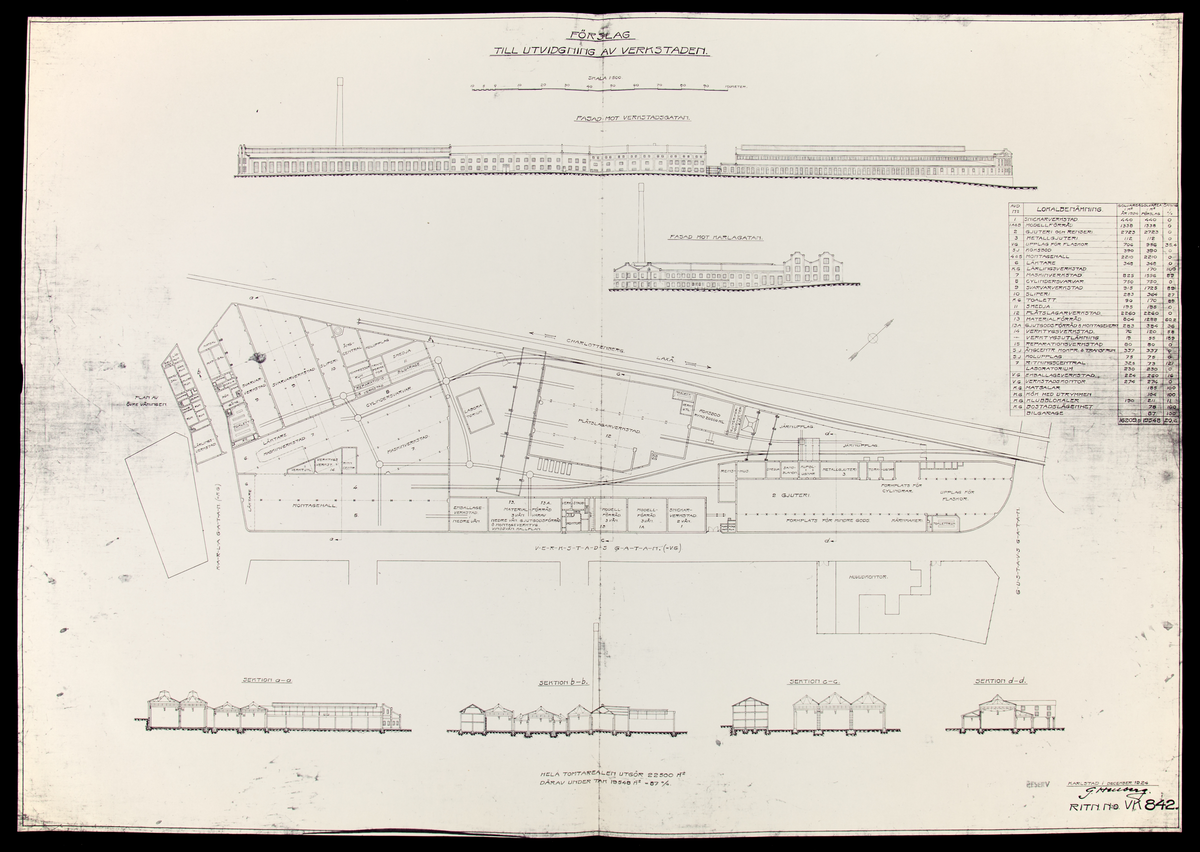 Ritning över Karlstads mekaniska verkstad. Förslag på utvidgning av verkstaden.