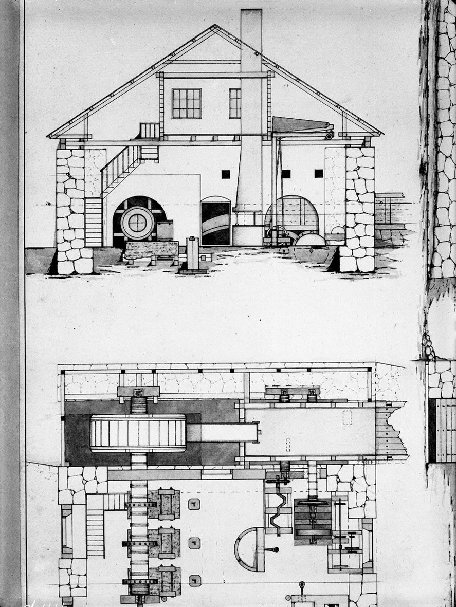 Detalj av laverad färgritning över storverkstaden i Wedevåg.
