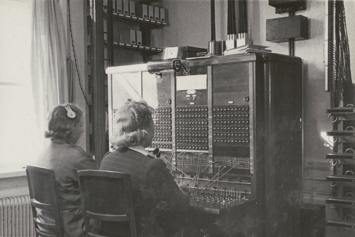 Två kvinnor sitter vid sk. telefonväxelbord, kopplar samtal för hand. Bild tagen på Drottningholm, Stockholm.