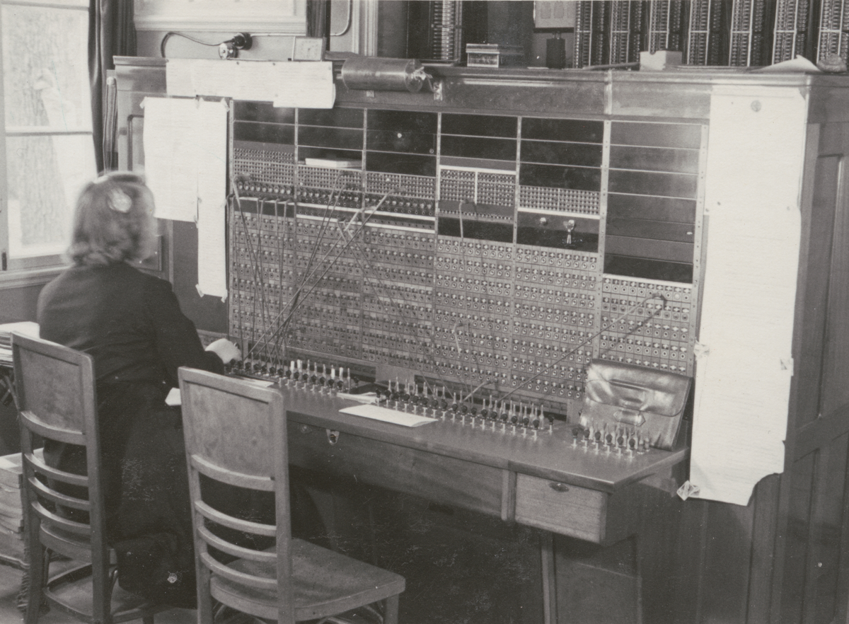 Telefonväxelbord i Gustavsberg med troligen växelstationsföreståndare Tibbelin i arbete.